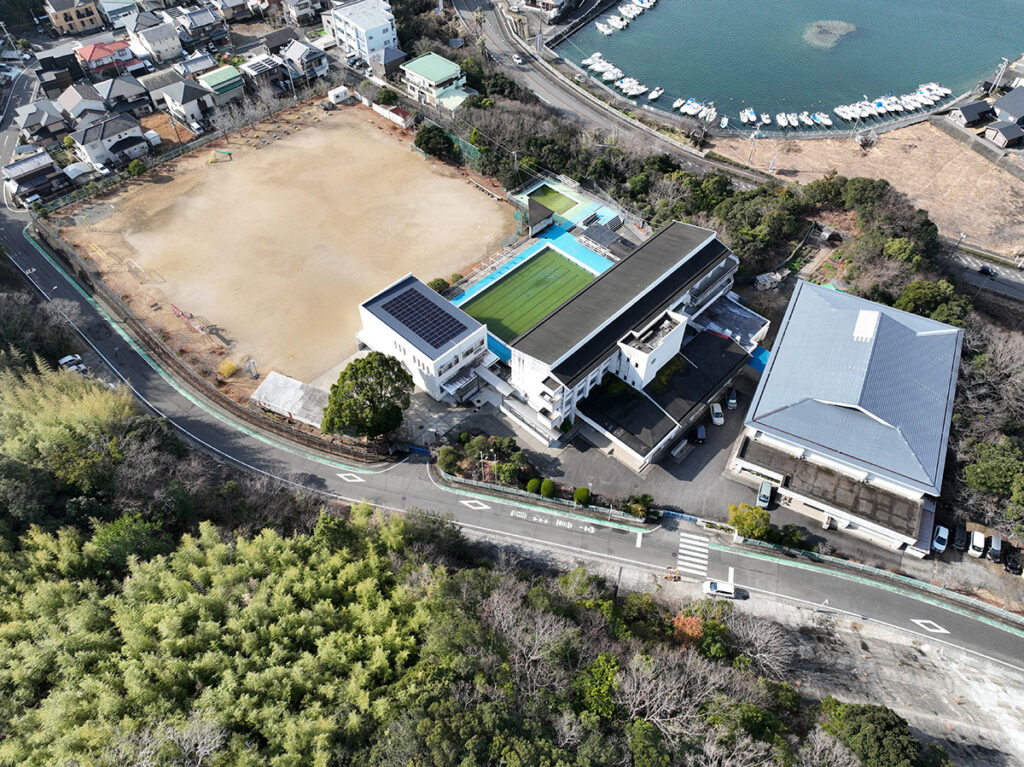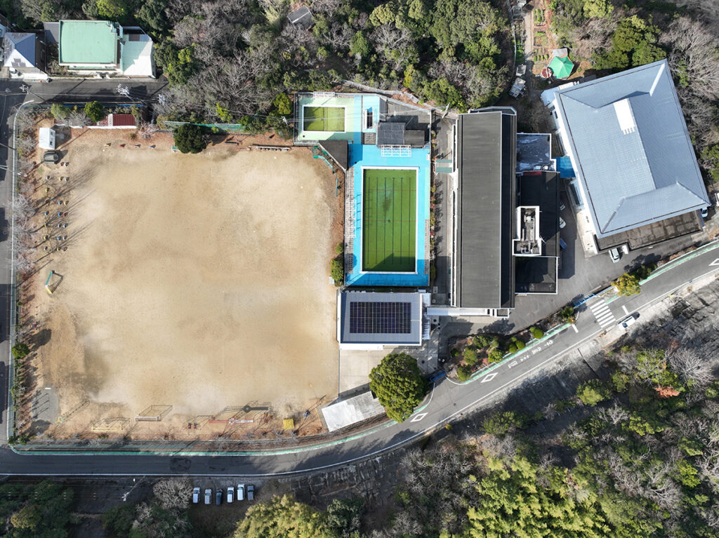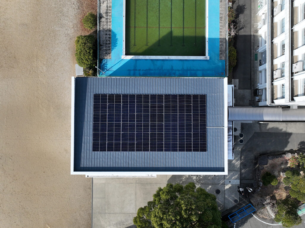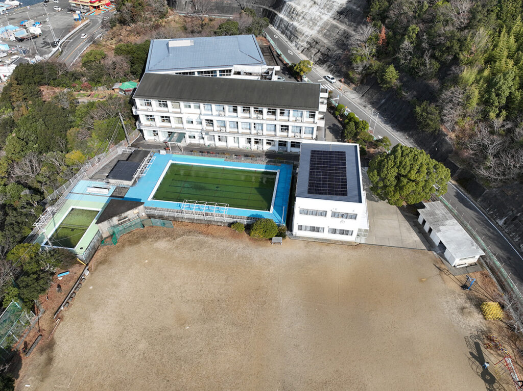 本校は高台に位置し、自然に囲まれた環境にある小学校です。今回の工事では、屋上スペースを有効活用し、発電効率と安全性を両立する設計・施工を実施しました。発電した電力は校内で有効活用され、日常の電力使用の一部を再生可能エネルギーでまかなうことで、温室効果ガスの削減と環境負荷の軽減に貢献しています。